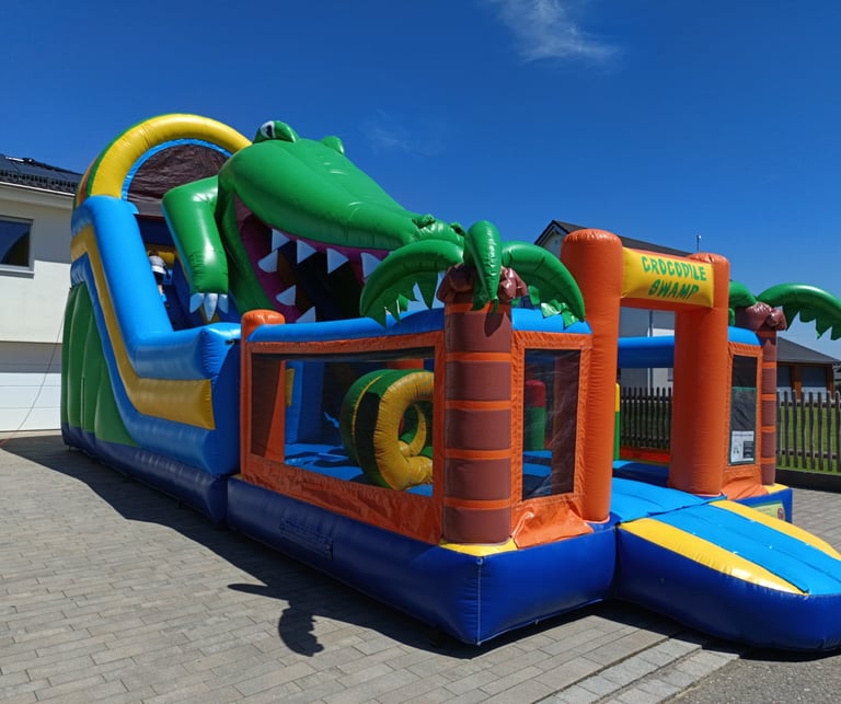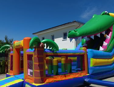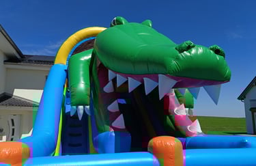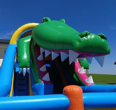 Unsere Krokodilrutsche ist der absolute Hingucker auf jedem Fest. Mit ihrem spektakulären Design, dem rießigen Maul und der extra langen Rutschbahn bietet sie Nervenkitzel und Hüpffreude pur!