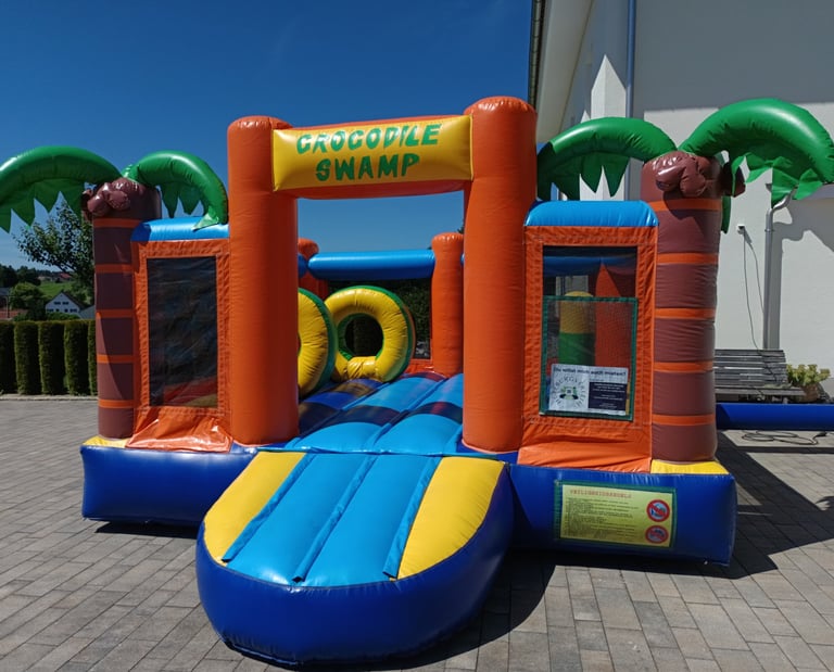 Willkommen im Krokodilsumpf - der abenteuerlichen Hüpfburg mit echtem Dschungel-Feeling. Diese Hüpfburg ist nichts für Angsthasen: Kinder müssen durch große Krabbelringe klettern, sich an wilden Boxelementen vorbeikämpfen und natürlich ausgiebig hüpfen, lachen und toben