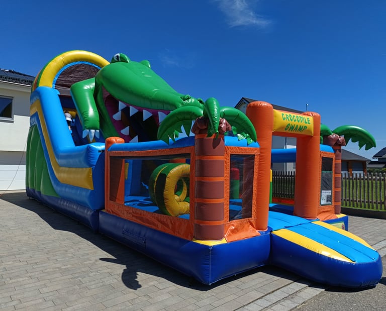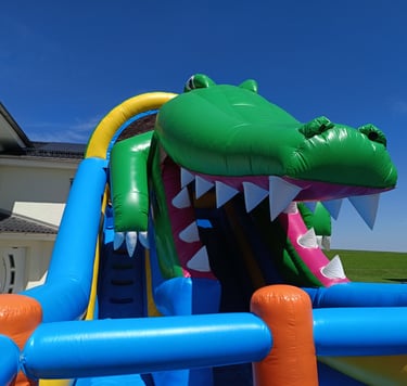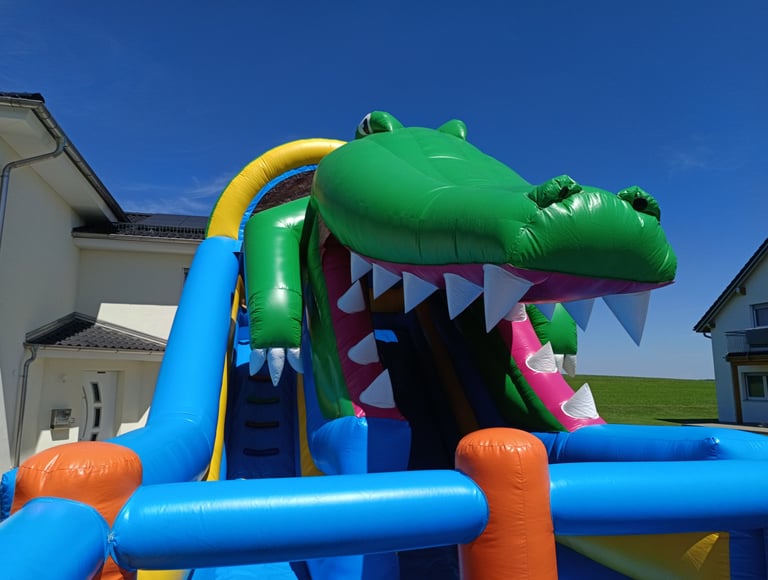 Unsere Krokodilrutsche ist der absolute Hingucker auf jedem Fest. Mit ihrem spektakulären Design, dem rießigen Maul und der extra langen Rutschbahn bietet sie Nervenkitzel und Hüpffreude pur!